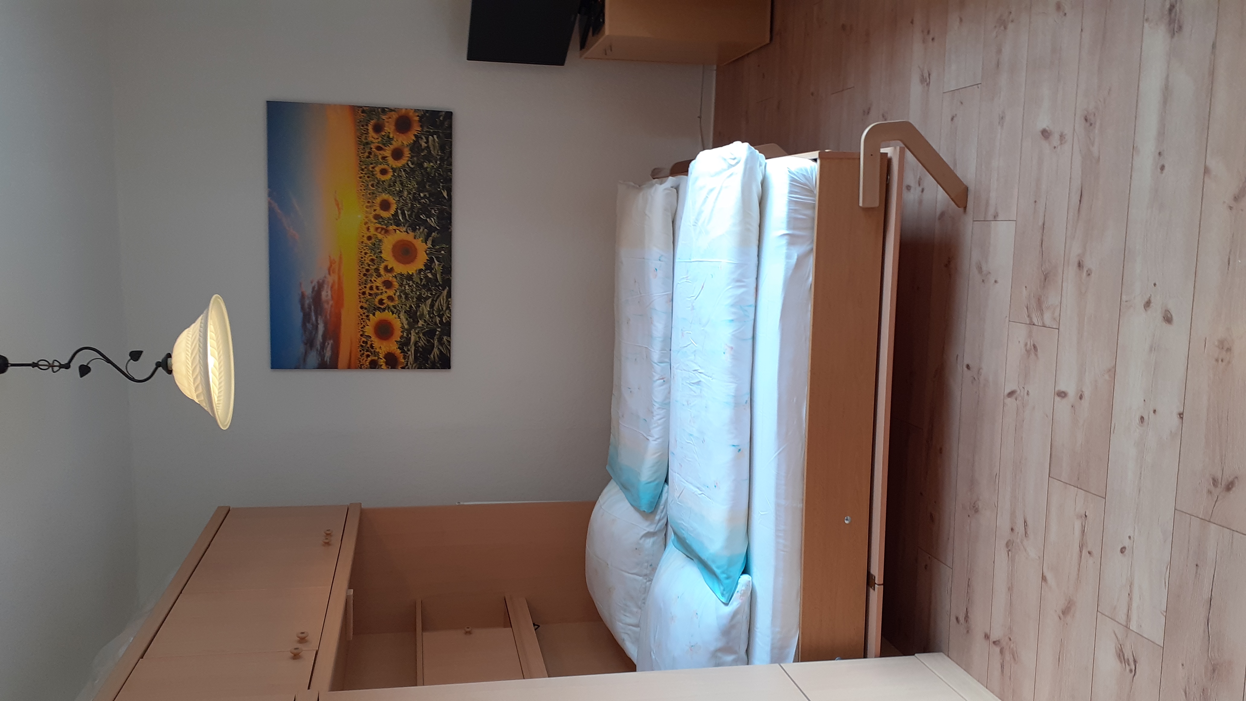 Als Schlafgelegenheit dient ein Doppelschrankbett, welches auch einzelnd runtergeklappt werden kann.